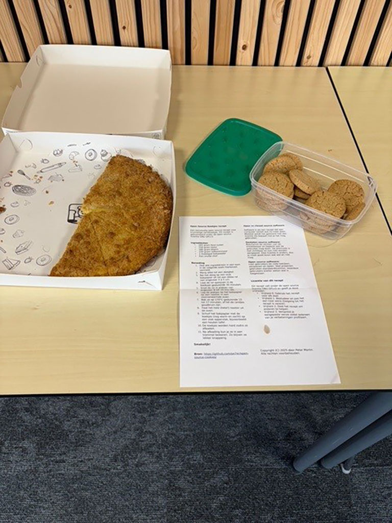 Peter Martin van DB8 arriveerde en had overheerlijke OpenSource Cookies gebakken! je kunt het openSource recept hier vinden, downloaden en je mag deze ook aanpassen en delen. Downlad het bestand en pak het Zip bestand uit, open dan het open-source-cookies-recipe.md, er staat ook een vegan versie in het Zip bestand.