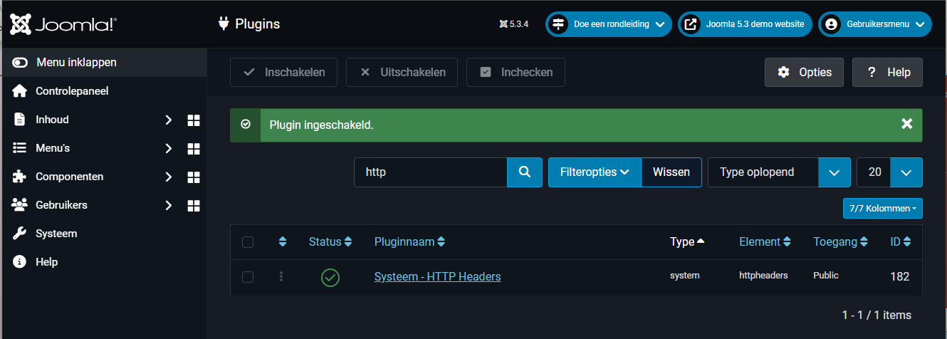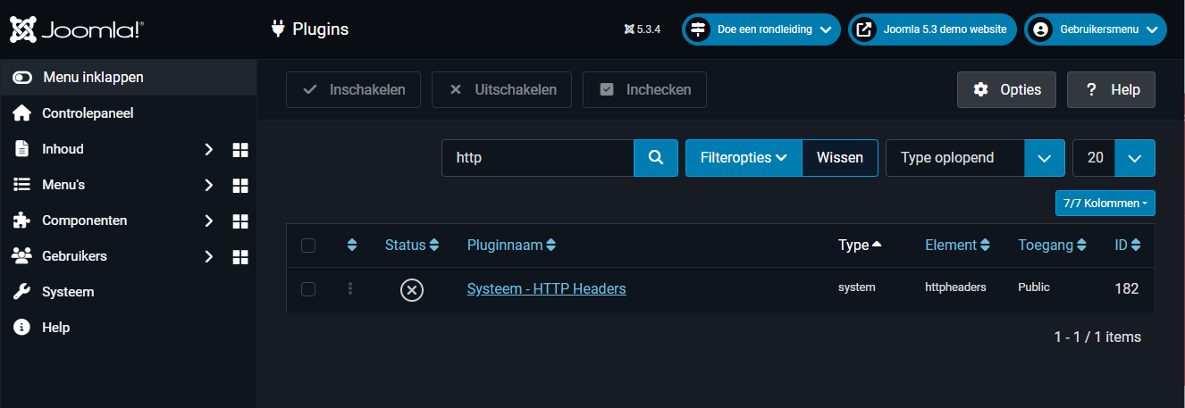 Nu schakelen we de http plugin in via Systeem > Plugins > zoek op http en klik op het grijs kuisje
