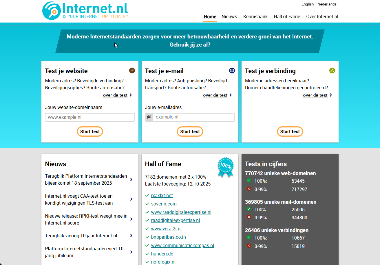 Wat is Internet.nl? Op Internet.nl kun je eenvoudig testen of je internet up-to-date is. Gebruiken jouw website, e-mail en internetverbinding wel moderne, betrouwbare Internetstandaarden? En, als dat niet zo is, wat kun je daar aan doen? Het is een initiatief van o.a. NCSC, SIDN en SURF.
