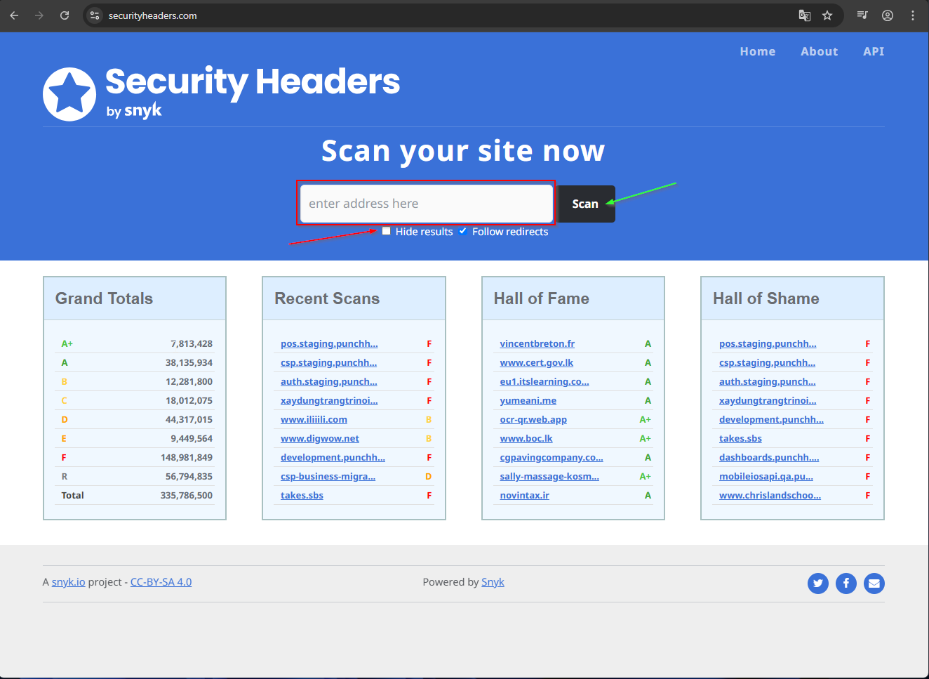 Let op: vergeet niet om voordat je start met een websitescan, om een vinkje te plaatsen bij Hide results! Indien je website een slechte score heeft kom je in de wall of shame te staan! Zie onderstaande print screen.