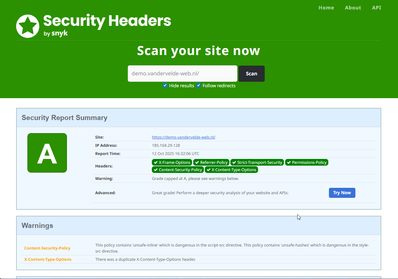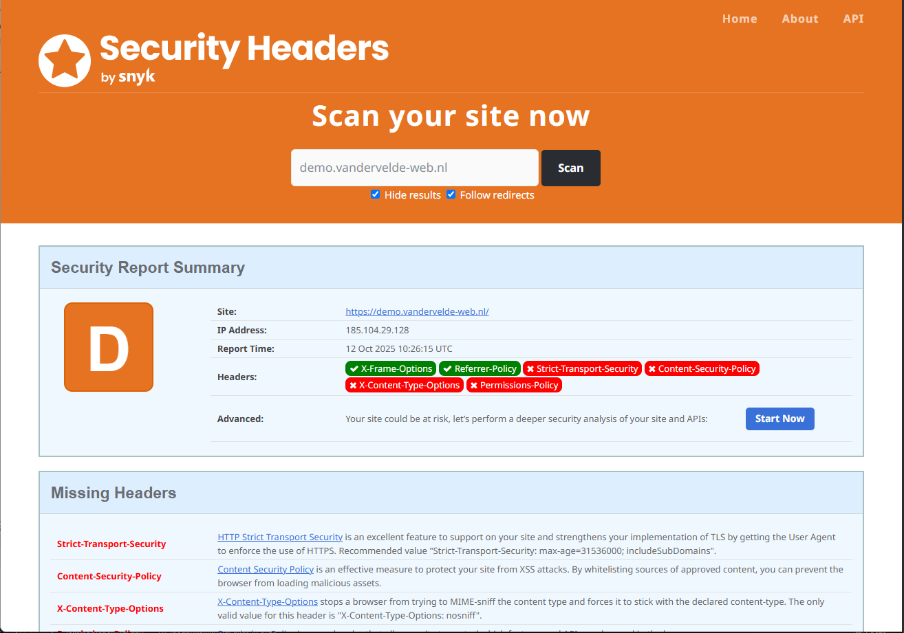 Je kunt je website scannen en bekijken hoe goed jouw website beveiligd is. Hierbij zou je moeten streven om een 100% te soren. Hierbij ben je mogelijk afhankelijk van je hosting provider aangezien diverse technische instellingen op webserver niveau plaatsvinden.